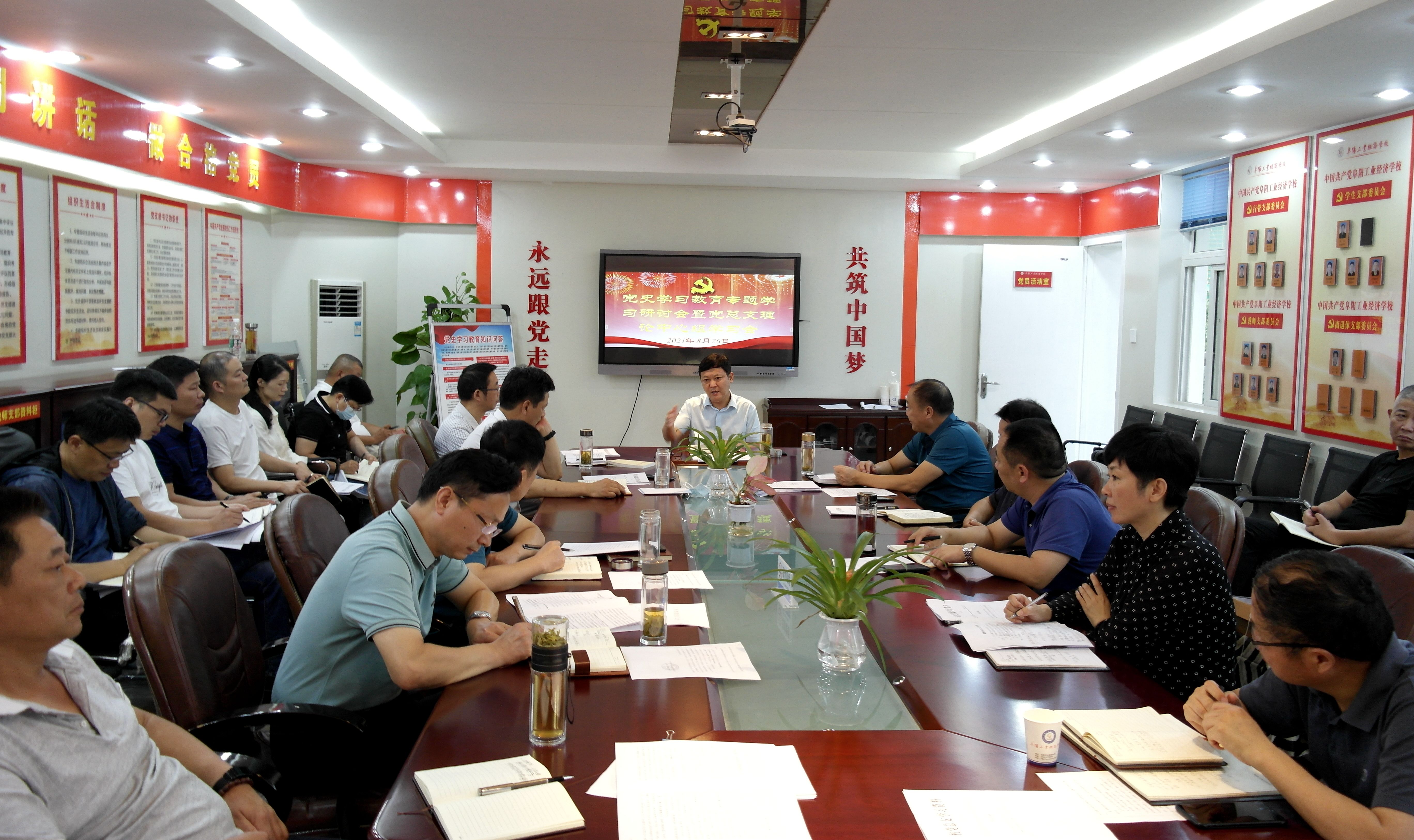 8月26日,阜阳工业经济学校召开党史学习教育专题学习会暨党总支理论学习中心组学习(扩大)会,校班子成员、各科室负责人参加会议,会议由校党委书记、校长周波主持。