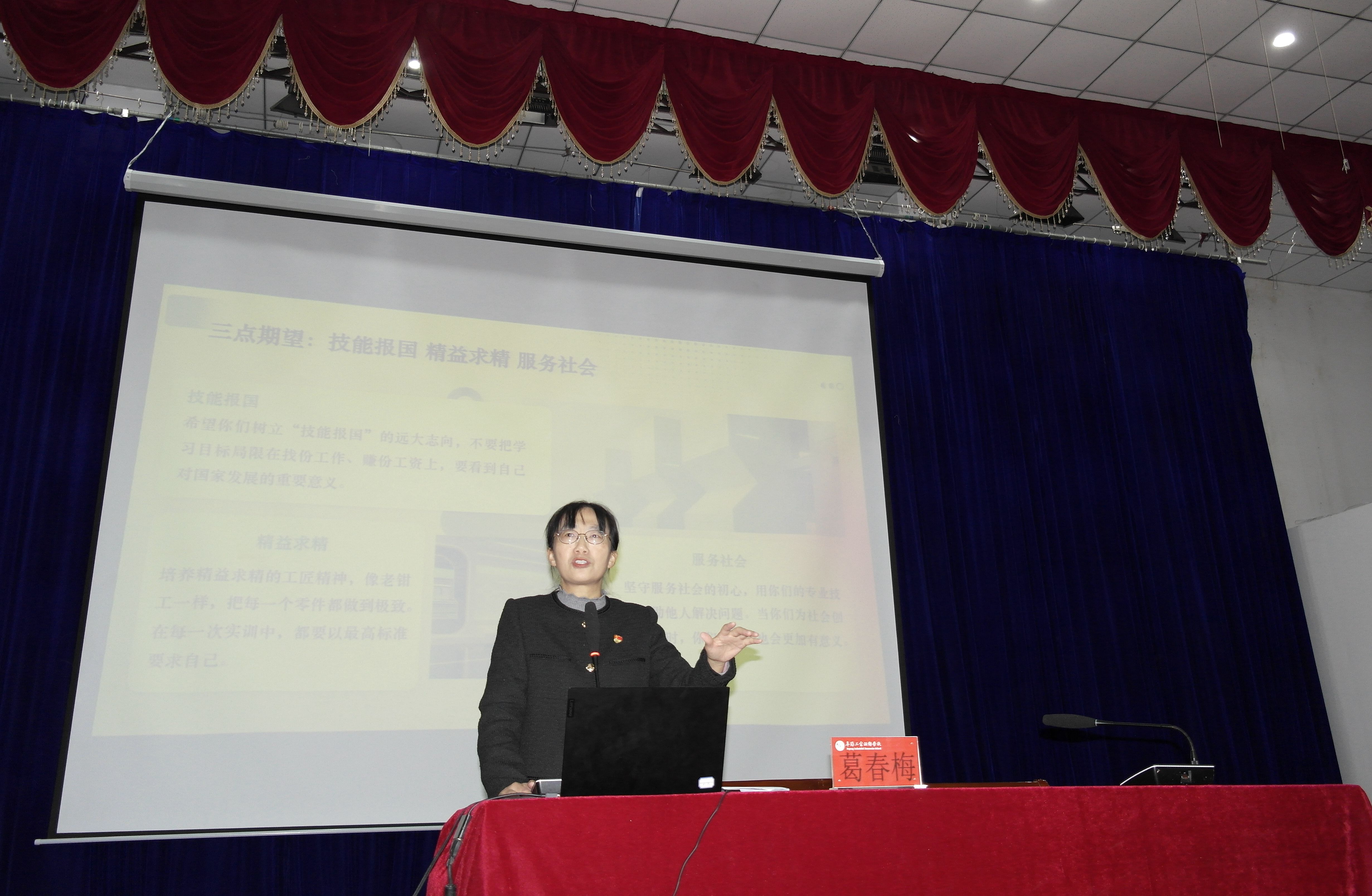 作为深耕思政教育的一线教师,葛春梅老师巧妙将思政课堂与现实生活相融合,在分享中寄语广大青年学子:要珍惜青春时光,既要在知识的海洋中汲取养分、提升专业技能,更要在品德的淬炼中涵养初心、树立正确价值观;要以身边榜样为镜,主动学习“崇德向善”的精神,从主动问好、垃圾分类等小事做起,从爱护校园、帮助同学等细节践行,让 “文明”成为一言一行的自觉,让“向善”成为成长路上的底色。