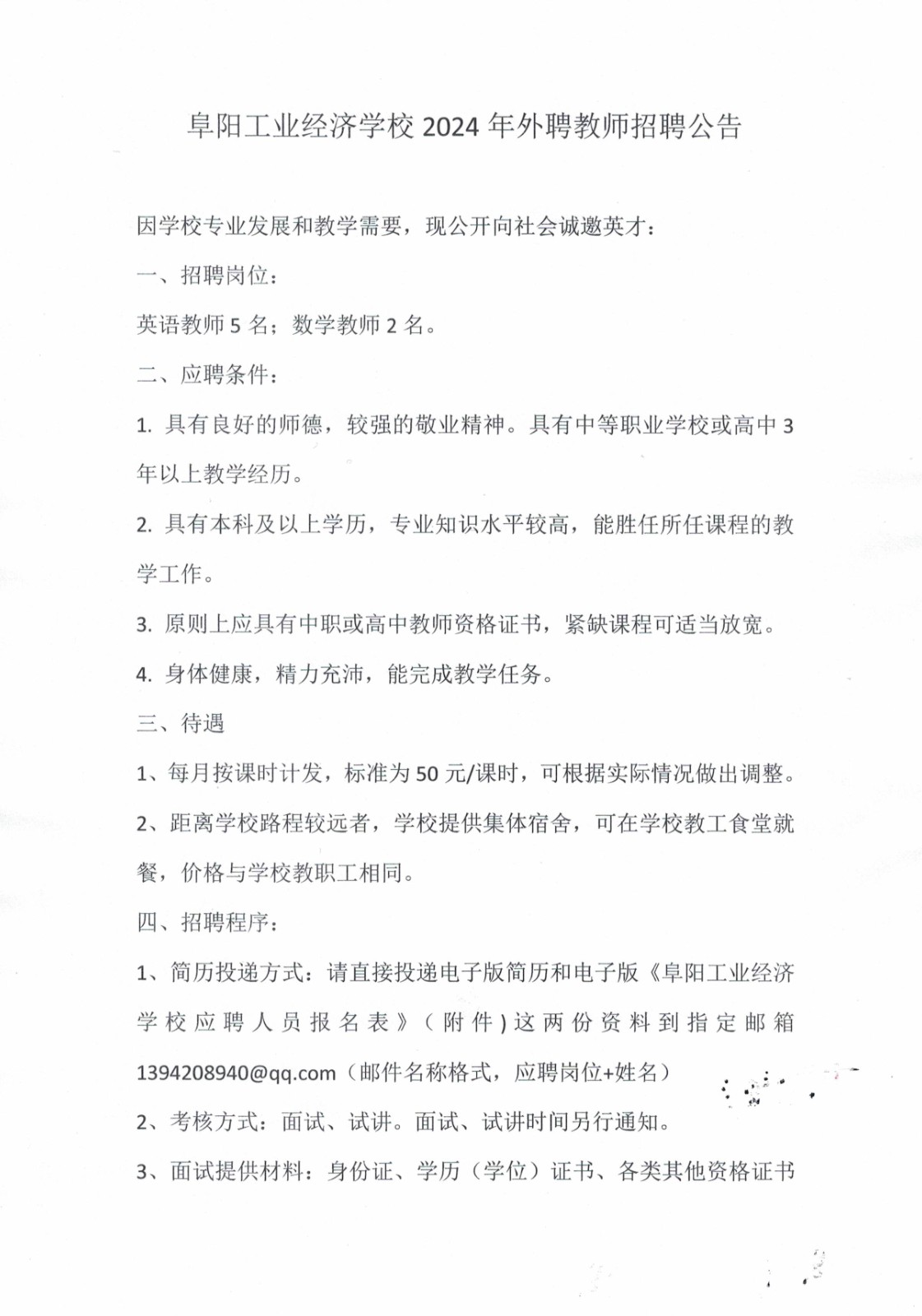 阜阳工业经济学校2024年外聘教师招聘公告