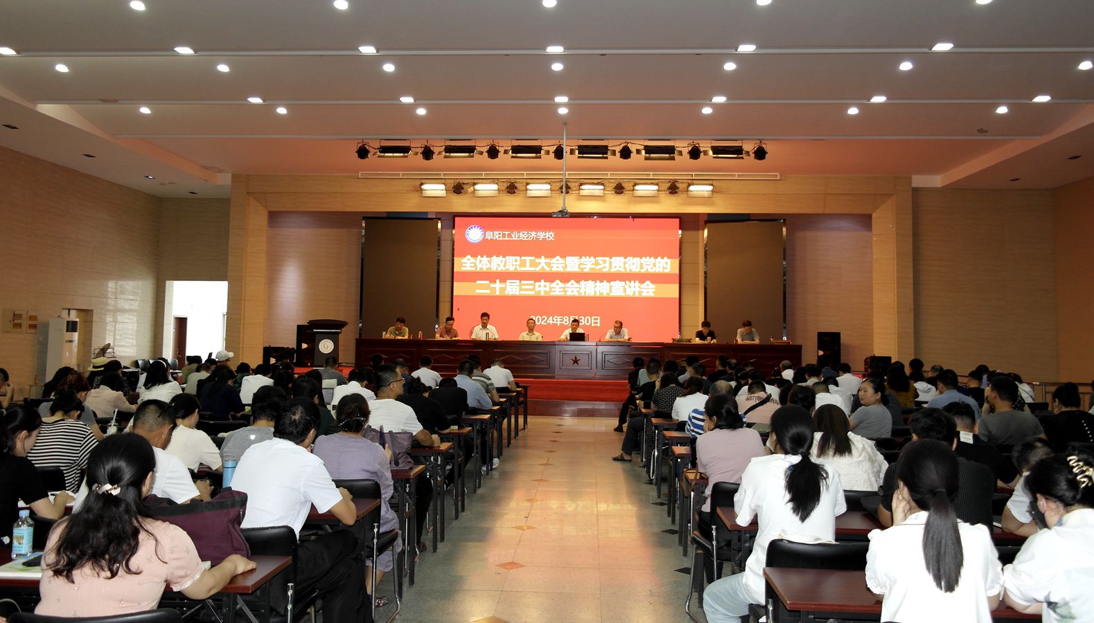 8月30日,阜阳工业经济学校召开全体教职工大会暨学习贯彻党的二十届三中全会精神宣讲会,校班子成员及全体教职工参加会议。