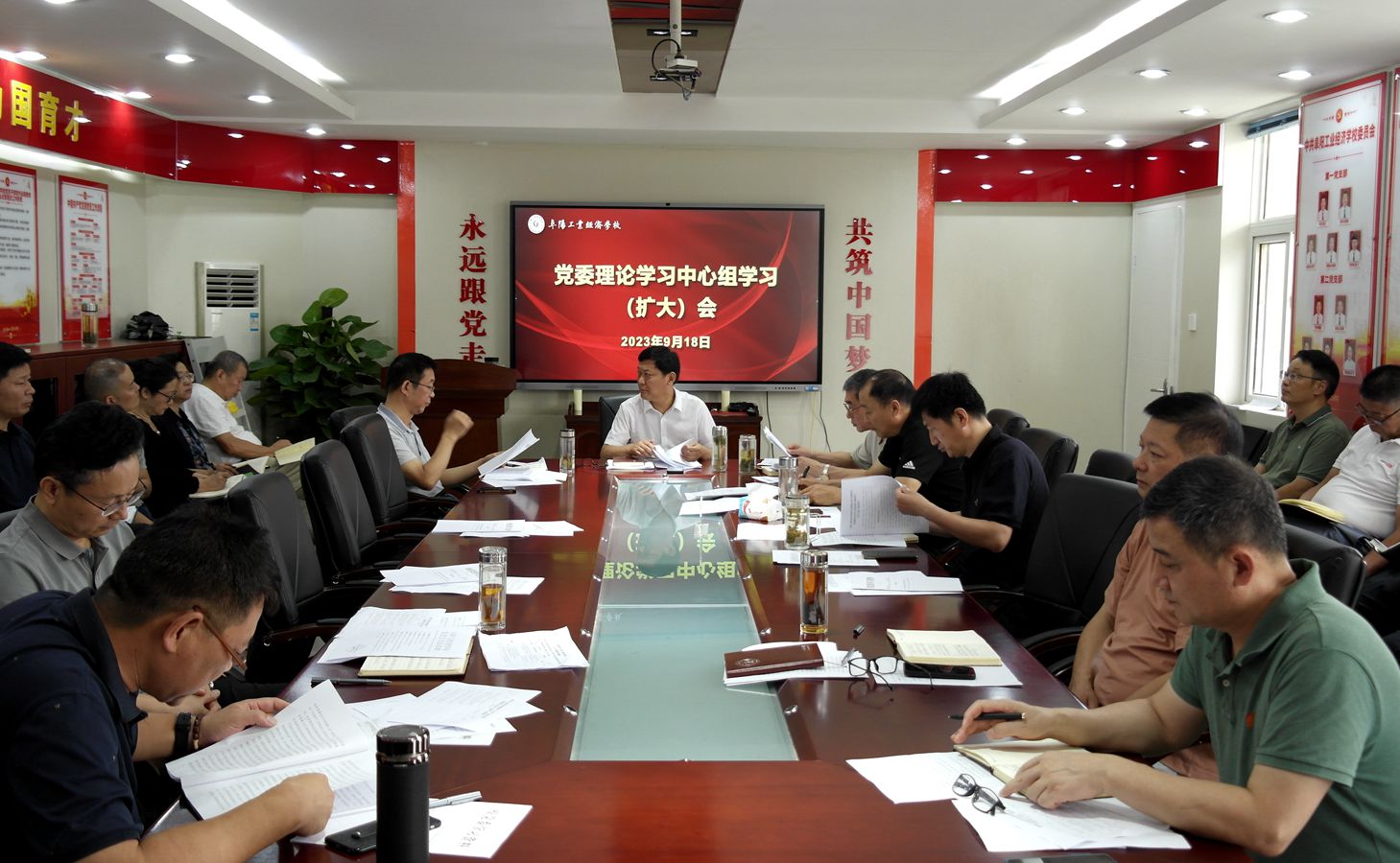 9月18日,我校召开党委理论学习中心组学习扩大会。传达学习市委六届五次全会精神。校班子成员、各科室负责人参加会议。会议由校党委书记、校长周波主持。