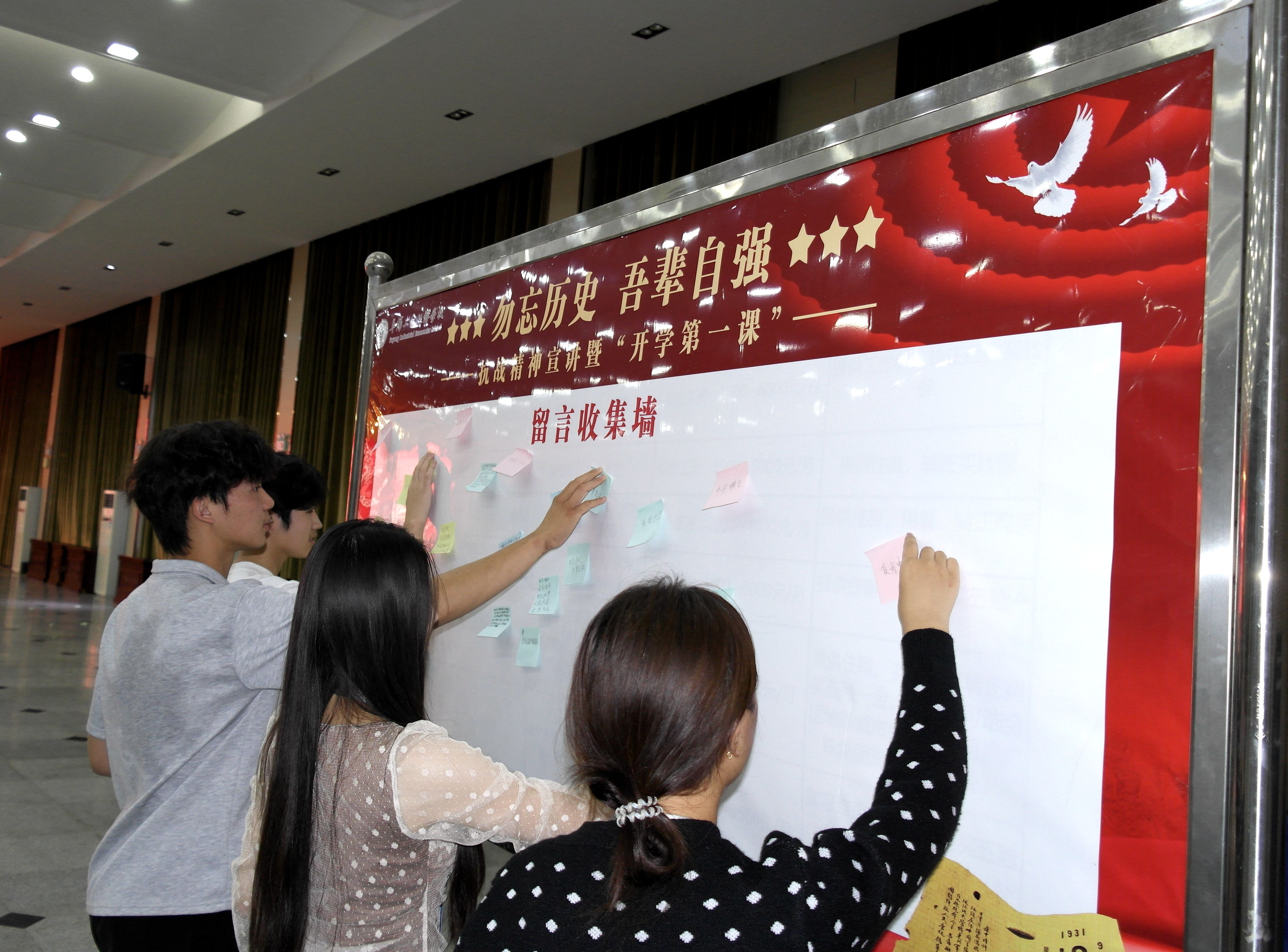 活动现场,同学们提笔书写感悟,并将心声贴至寄语墙,传递传承红色信念、奋发向上的坚定决心。活动最终在全体齐唱《保卫黄河》的雄壮歌声中落下帷幕。此次活动将抗战精神宣讲与“开学第一课”深度融合,旨在营造“知史爱党、知史爱国”的浓厚氛围,引导青年学生树立远大理想、厚植家国情怀,立志成长为担当民主复兴大任的时代新人。