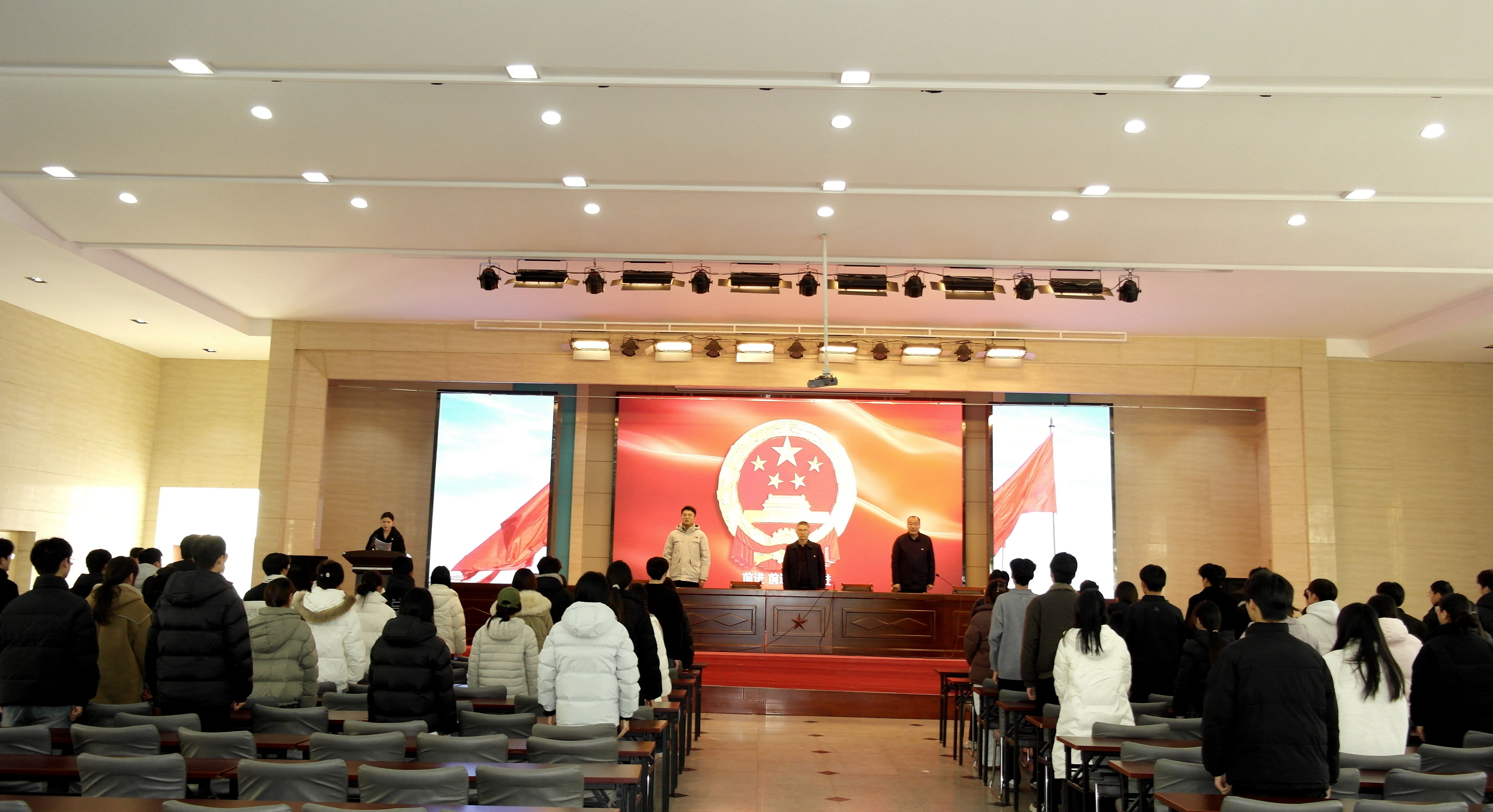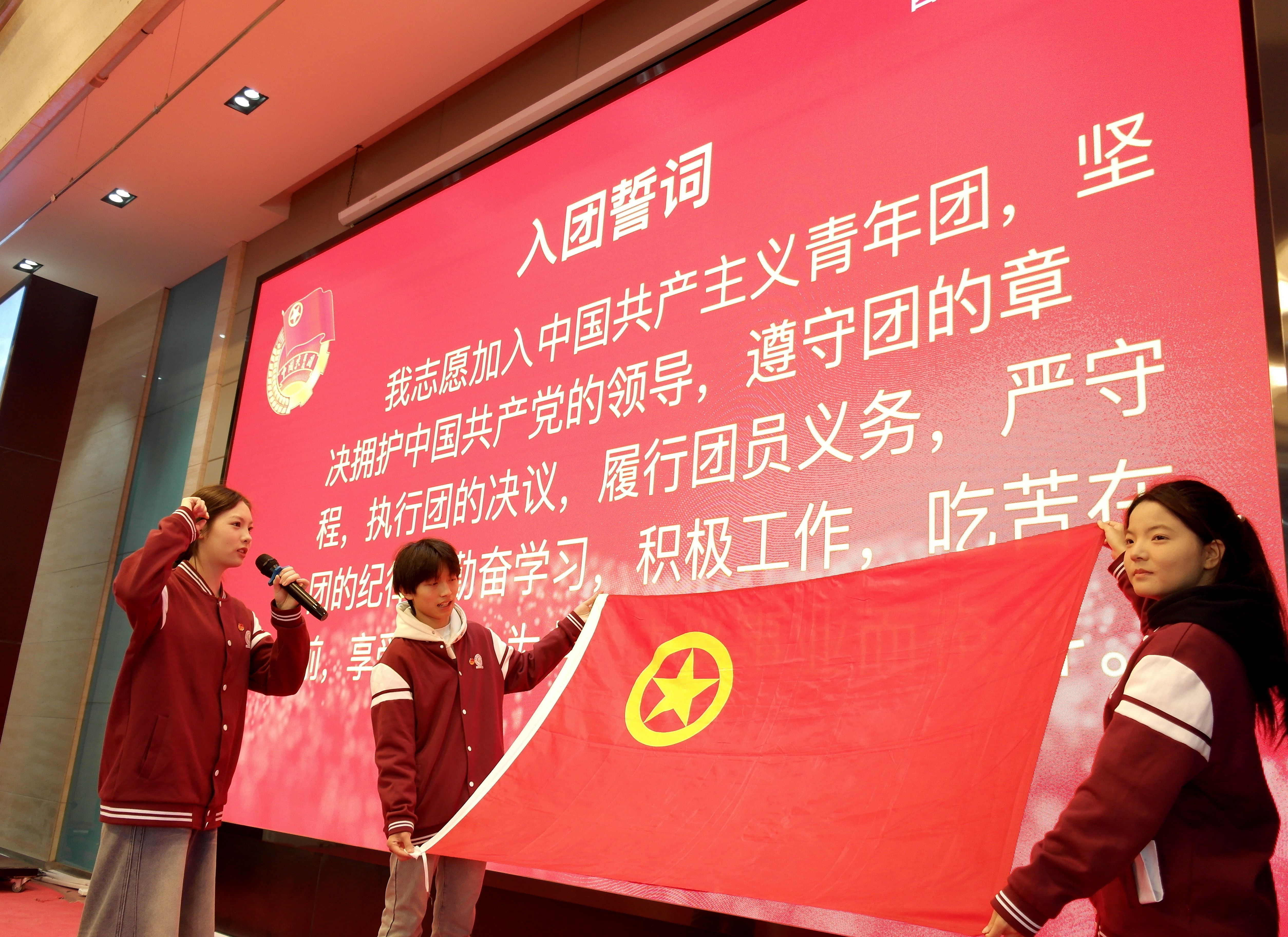 国歌旋律响起,全场肃立高歌。激昂乐声与蓬勃青春之声交织回荡,新团员眼中闪烁着赤诚的爱国光芒,让即将启幕的入团宣誓,更添深切的使命与荣光。