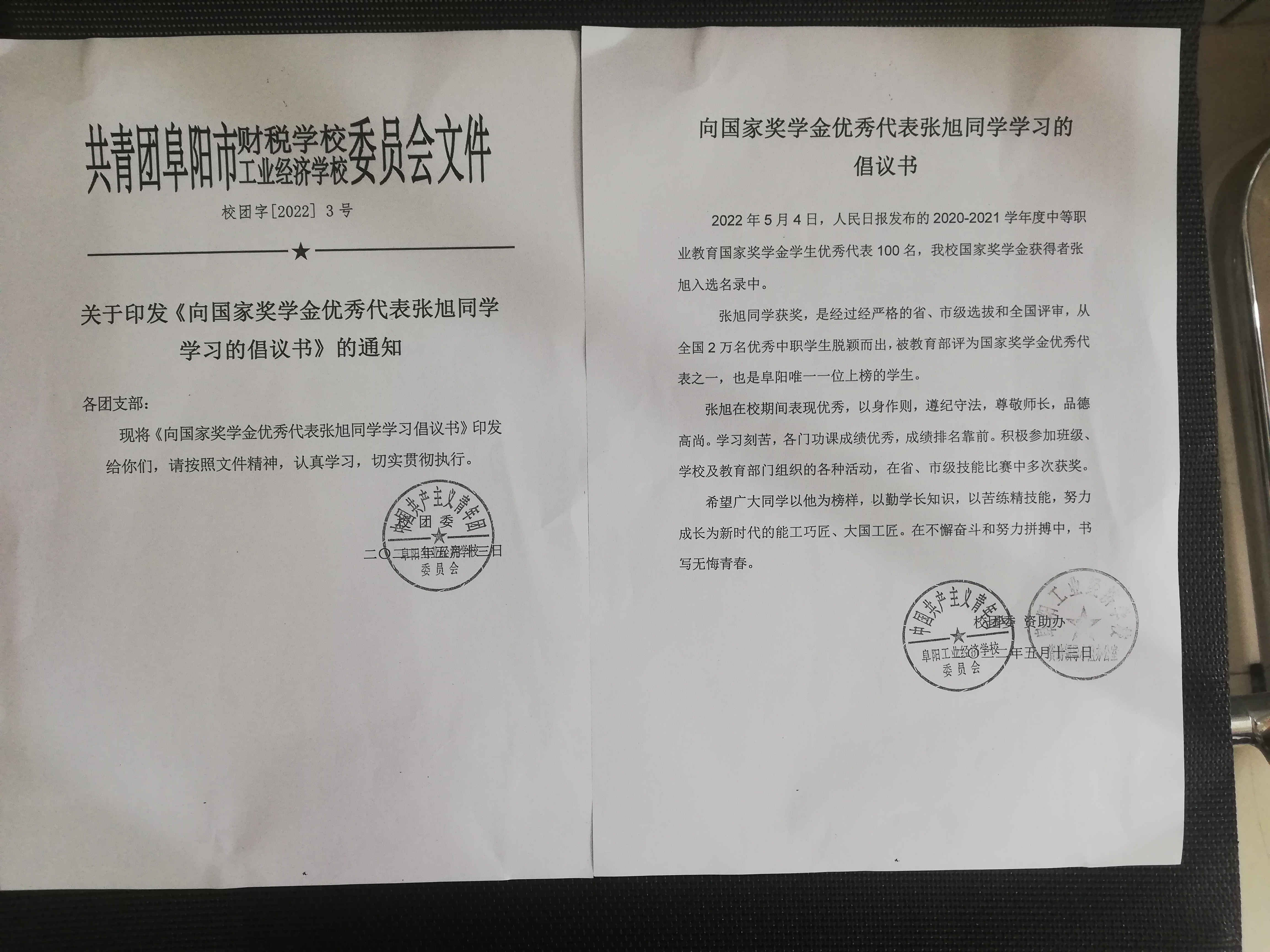 阜阳工业经济学校团委、资助办倡议向国家奖学金优秀代表张旭同学学习