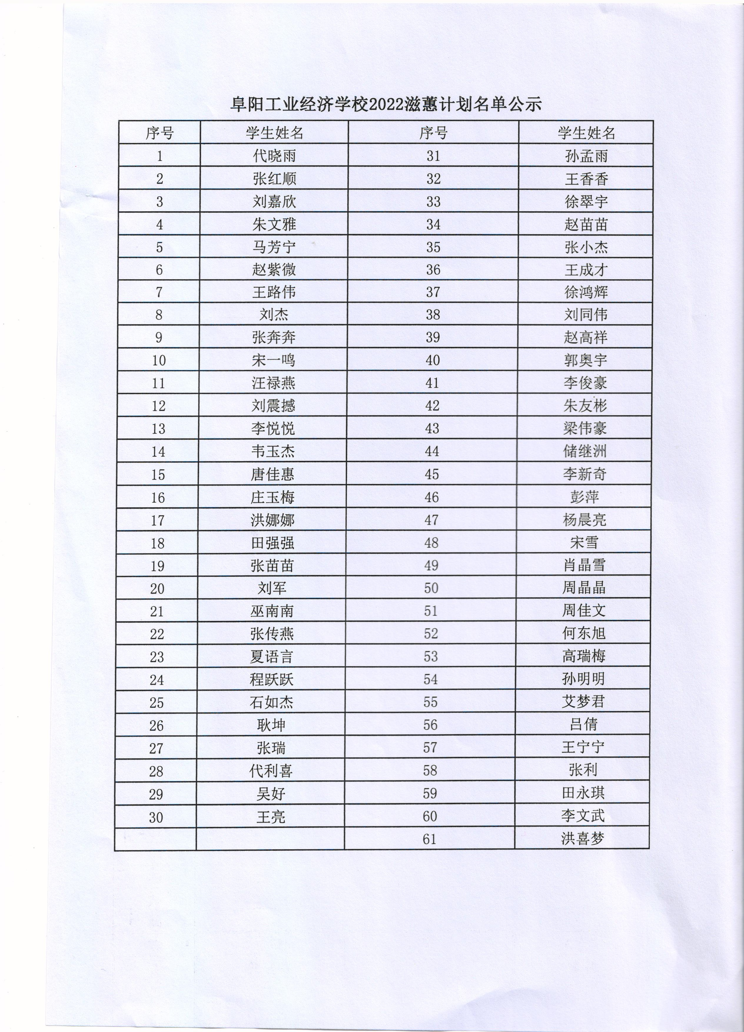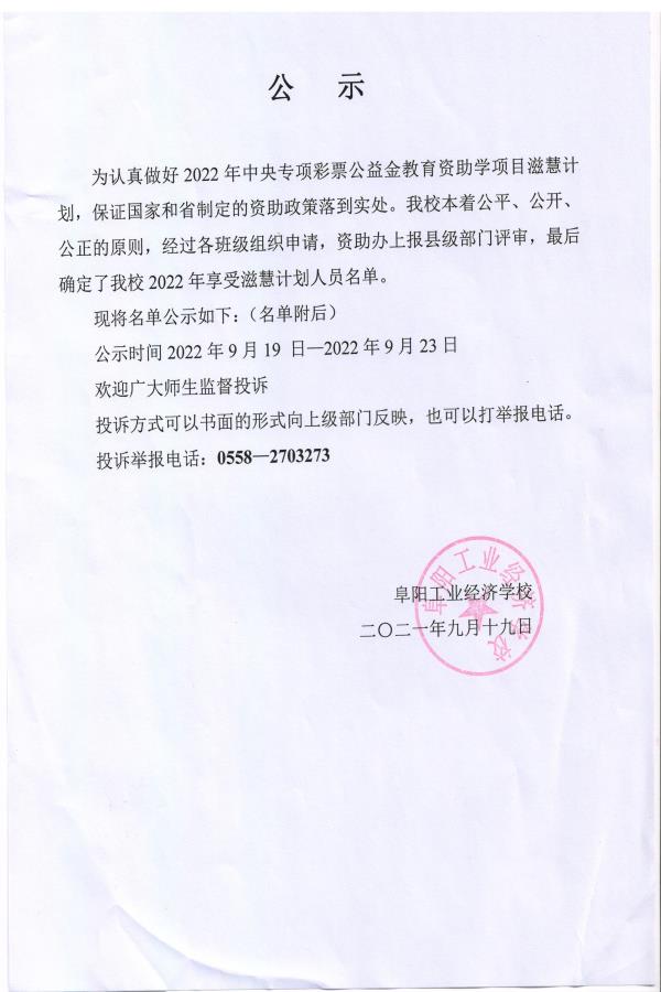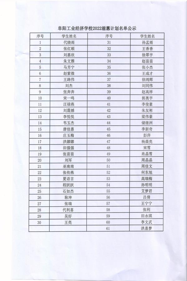 阜阳工业经济学校2022年滋蕙计划名单公示