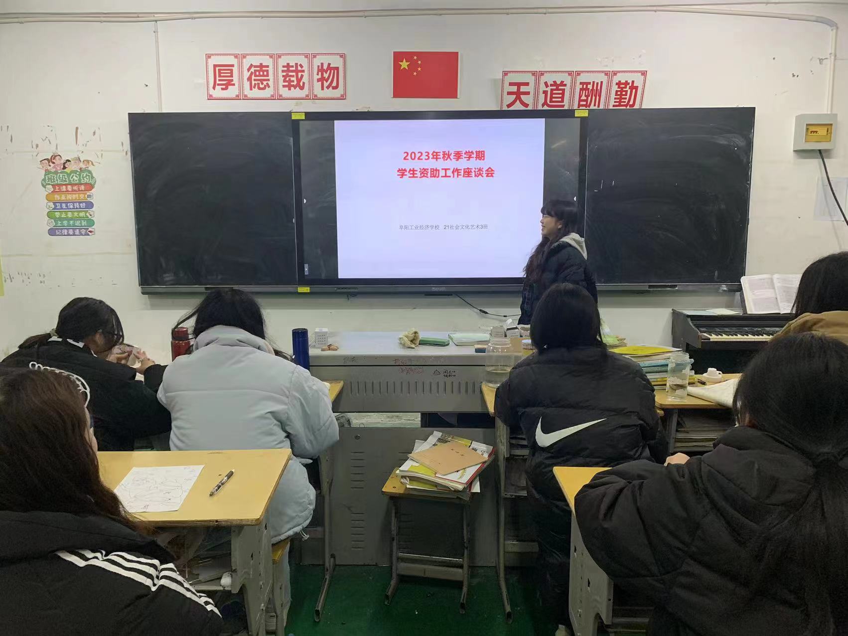 阜阳工业经济学校本周各班级按照校资助办要求利用晚自习时间开展学生资助工作座谈会。